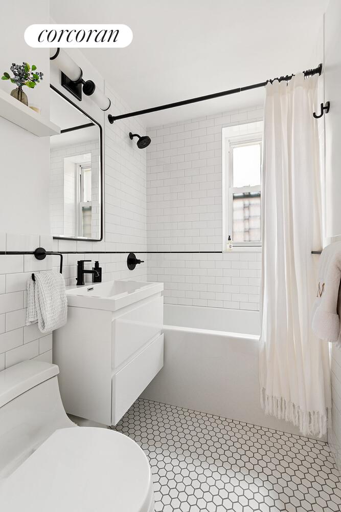 The spacious living room easily accommodates both lounge and dining areas and is anchored by hardwood floors and a beautifully scaled eastern-facing window that welcomes natural light all day. The windowed kitchen features full-size stainless steel appliances and solid wood cabinetry. The oversized bedroom enjoys two exposures, custom built-ins, and ample closet space. A crisp, recently renovated bathroom includes hexagonal tile, white subway tile, matte black fixtures, and a deep soaking tub. The in-unit LG washer/dryer is discreetly housed in a hallway closet for ultimate convenience.