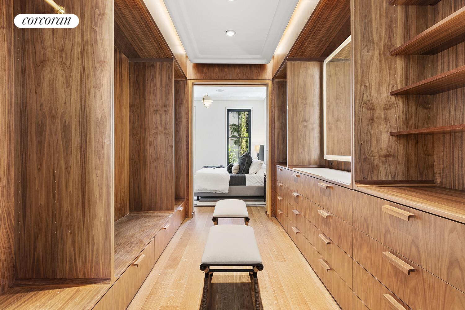 The second floor features the primary suite- a large bedroom with a gas fireplace, en-suite bath, dressing room, and an office, also with an en-suite windowed bath. The pass-through walnut dressing room has beautifully fit-out custom closets. The windowed bath has a double sink, glass shower, cove lighting, and heated floors.