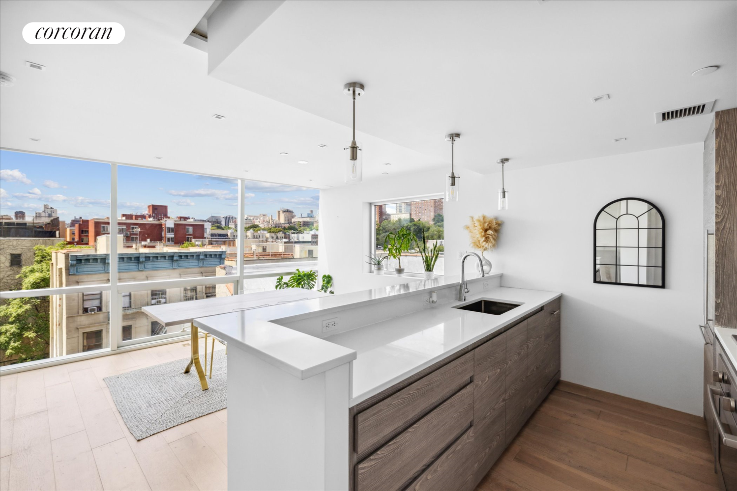 Welcome to your key locked residence at The Vidro. Immediately, you are greeted with high ceilings, unobstructed views and amazing natural light. The Penthouse is flooded with natural light from it's North and South floor to ceiling windows and overlooks all of Upper Manhattan, Central and South Harlem; including The Cathedral Church of St. John the Divine, Morningside Park, Columbia University, Midtown, New Jersey and more!! This residence features private direct elevator access and consists of 3 bedrooms 2 and a half bathrooms, a private roof deck, oak flooring throughout, custom designed cove lighting by RAB and central heating/cooling split air system by Daikin. The chef's kitchen is equipped with integrated wood paneled Blomberg & Bosch appliances and quartz countertops. The Italian porcelain tiled bathrooms at the The Vidro have heated floors and each unit includes a washer/dryer and a locked storage unit. Perfectly poised at the center of South Harlem, The Vidro is only steps away from Morningside Park and a close walk to the A, C, B, D, 1 and 2 subway lines, Whole Foods, Columbia University and noteworthy local restaurants.