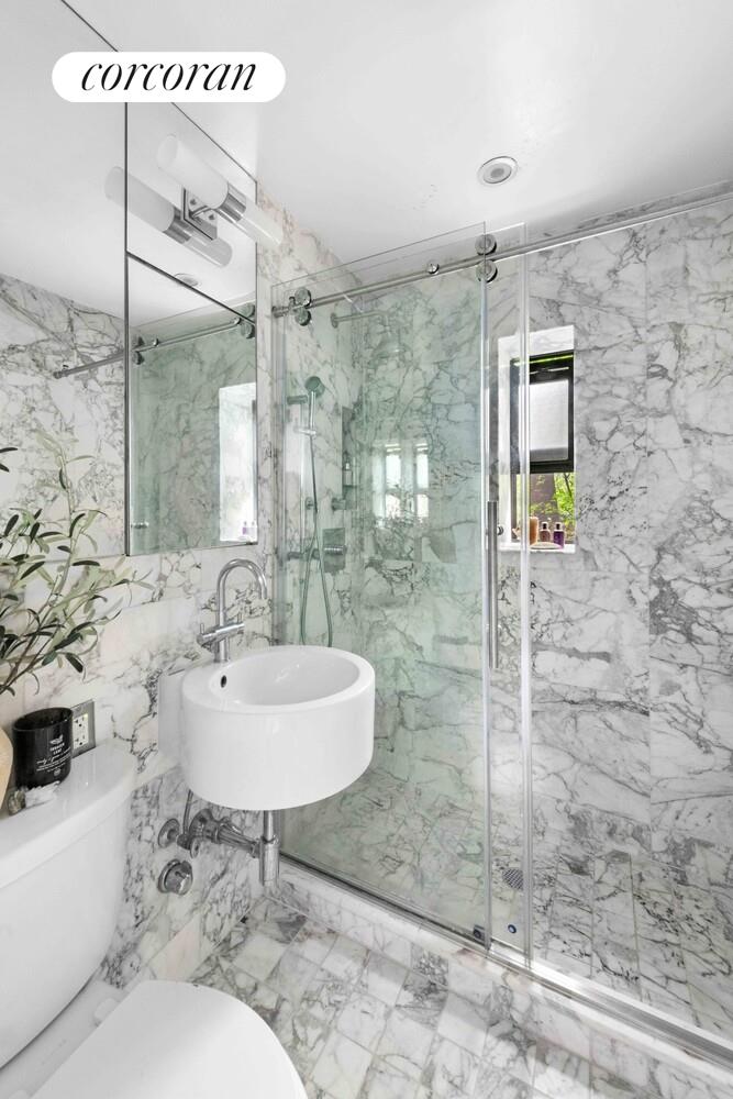 The separate kitchen has been renovated with marble countertops, glass tile backsplash, custom cabinetry, and stainless steel appliances, including a dishwasher. The windowed bath has been clad in stunning marble to create a luxurious place to wash off the day and through-wall AC unit has been installed in order to not obstruct those beautiful views. Pre-war details have been maintained throughout including original hardwood floors, as well as crown and wall moldings.