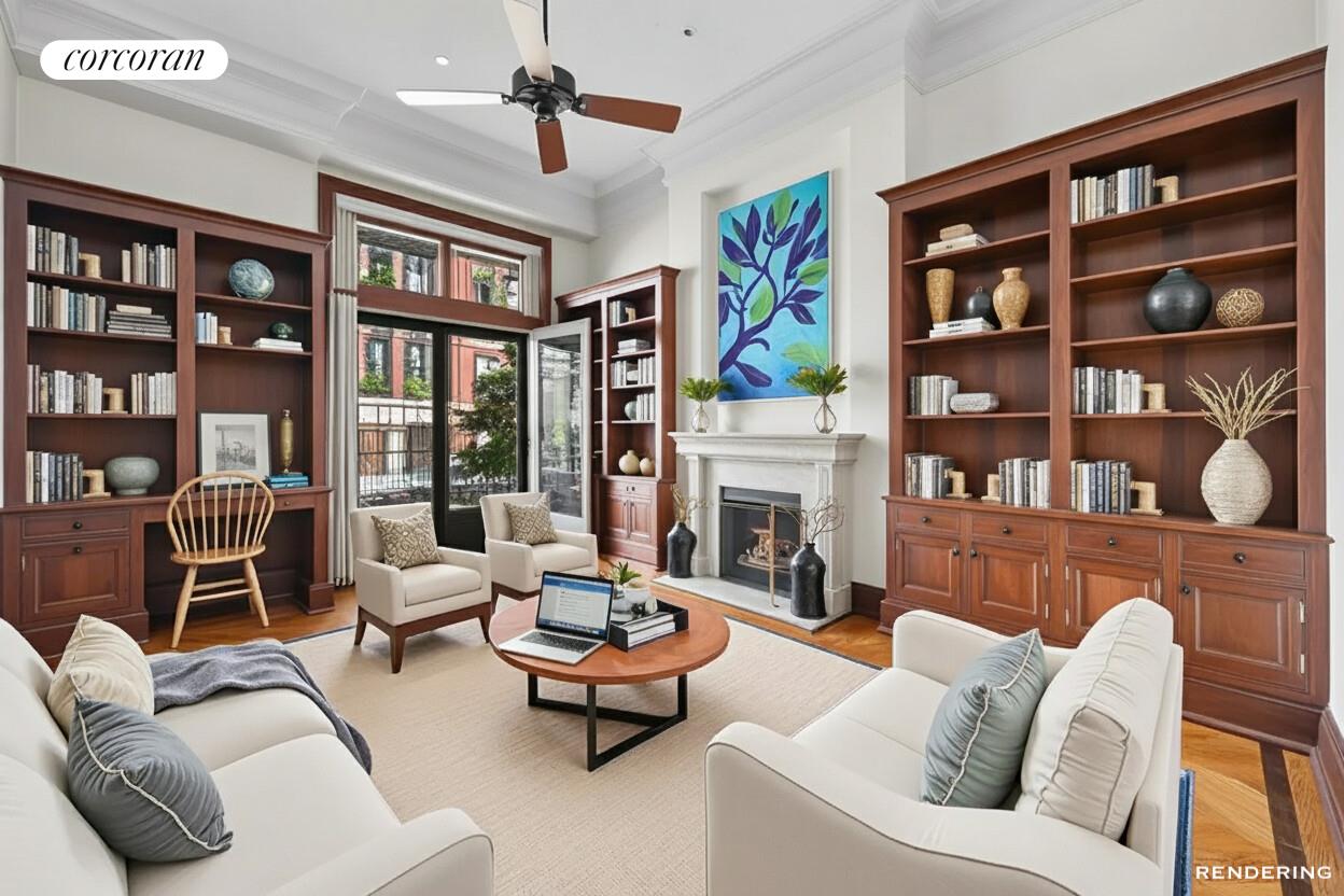 A Carrara marble vestibule leads into a center hall with 15-foot ceilings. The 500-square-foot primary parlor features inlaid mahogany floors, crown moldings, and the first of eleven fireplaces. French doors in the reception room open to 71st Street. The original mahogany-and-bronze elevator connects nearly every level of the house. The Drawing Rooma dramatic double-height room offers 20-foot vaulted ceilings, original herringbone parquet floors, and abundant natural light. A discreet service kitchen provides convenience for casual dining, coffee, or cocktails, with flexibility for a full kitchen redesign.