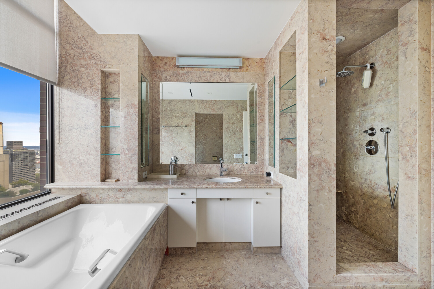 Adjacent to the kitchen, a sun-filled den with its own terrace, wine bar with 400-bottle Sub-Zero wine cooler, and powder room enjoys southern and eastern exposures.