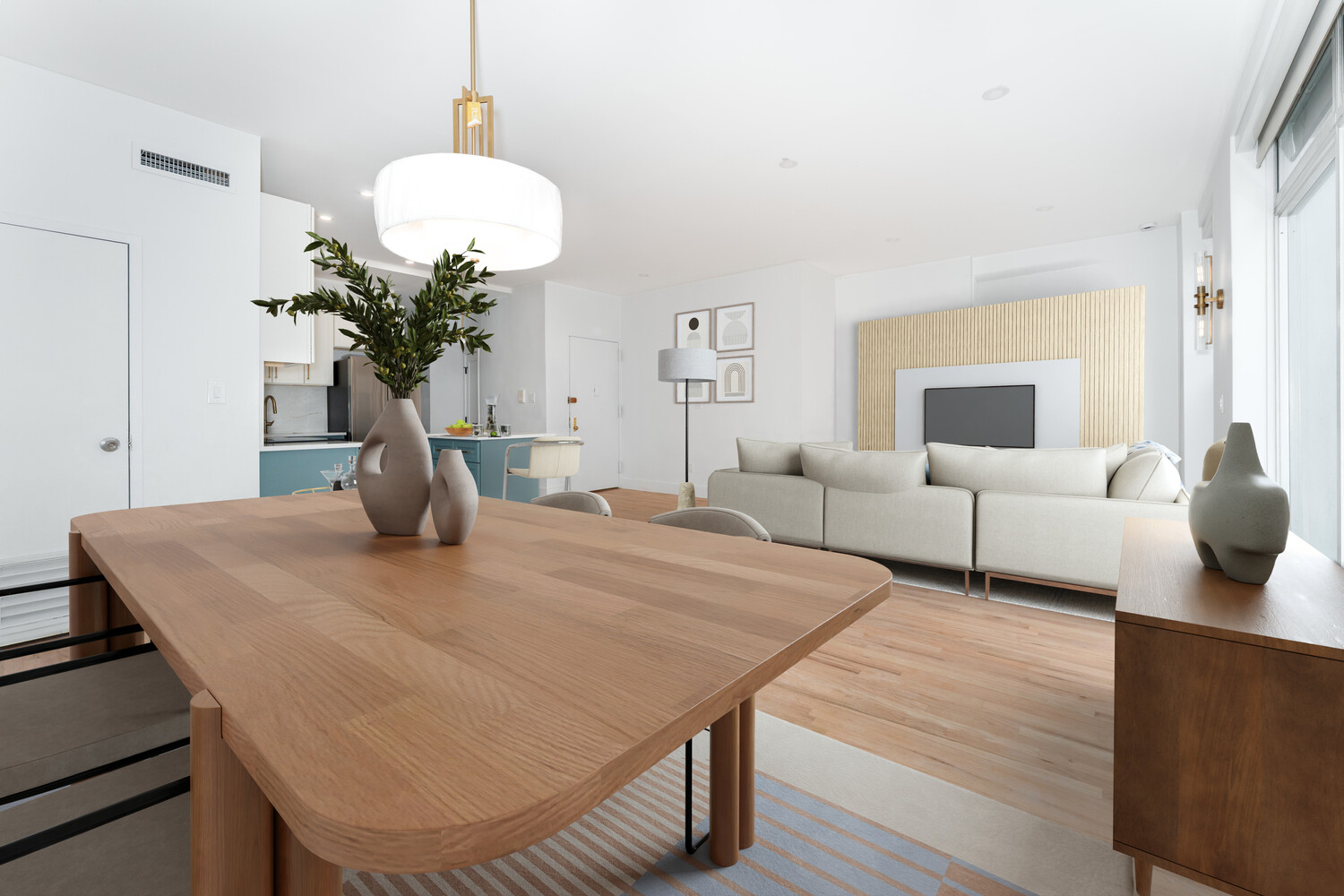 Expansive living and dining area with floor-to-ceiling windows