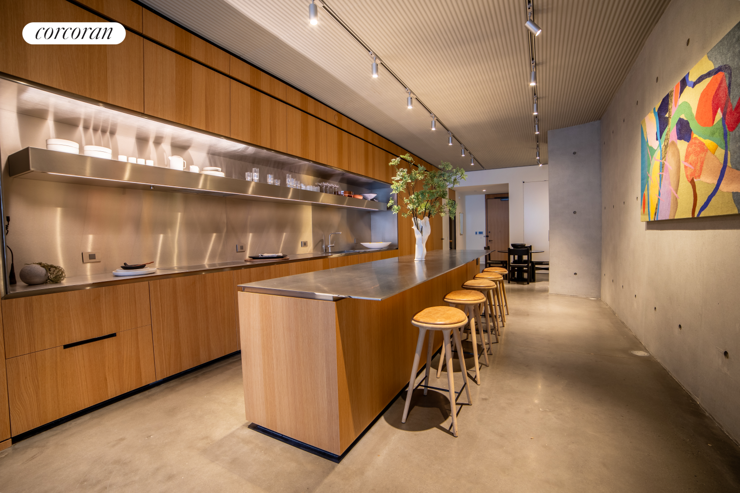 The Foster + Partners-designed open chef's kitchen features white oak cabinetry with integrated pulls and bronze detailing, cabinet-fronted Gaggenau stainless steel appliances, and brushed stainless steel knife edge countertop and backsplash with embedded ventilation and LED lighting - a true culinary delight that allows for seamless entertaining.