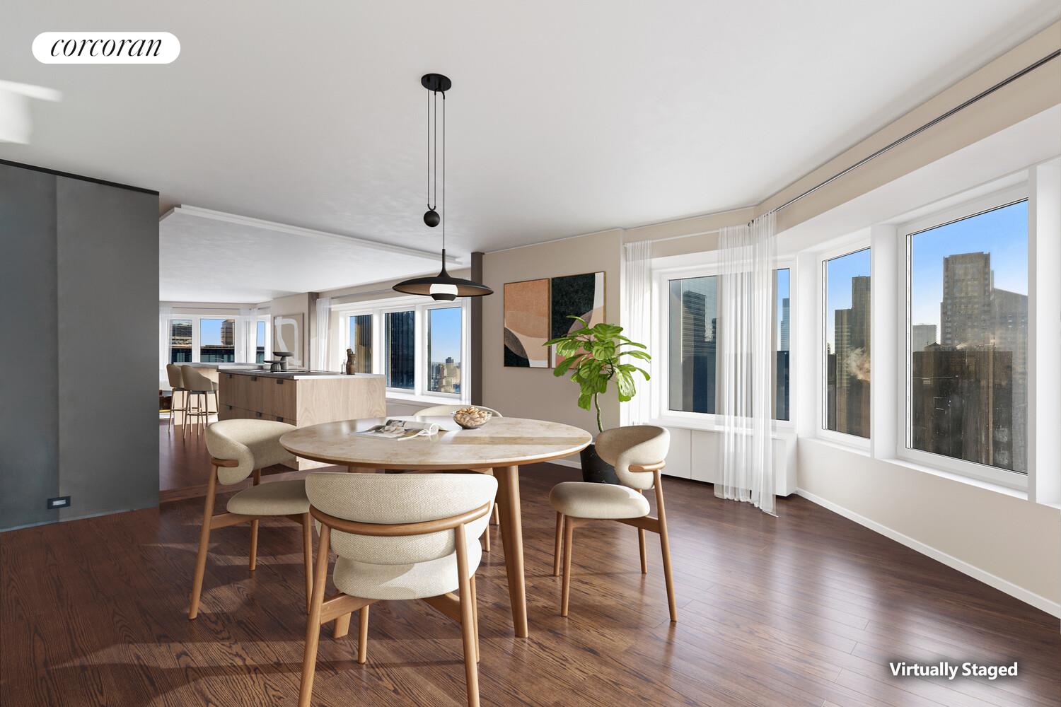 At the heart of this extraordinary residence is a 53-foot open-concept living, dining, and kitchen space, ideal for both grand entertaining and intimate gatherings. Sixteen oversized windows flood the space with natural light, providing breathtaking north, east, and south triple exposures, with partial views of Central Park enhancing the sense of openness. Bespoke millwork, custom finishes, and designer fixtures create a seamless flow of refined beauty throughout. The chef's kitchen is a standout, boasting marble countertops, custom cabinetry, and premium appliances, making it as visually stunning as it is functional.