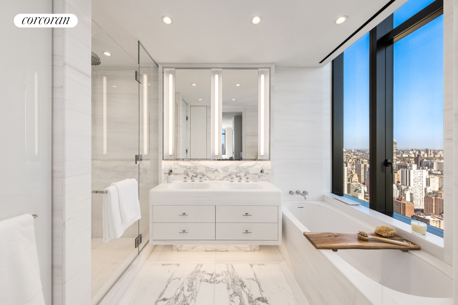 The north-facing primary bedroom boasts ample closet space, an en-suite bathroom elegantly ornamented with Bianco Dolomiti and Calacatta Gold marble, Toto Neorest water closets, and a soaking tub. The secondary bathrooms are embellished with Italian custom-crafted lacquer wood vanities, honed cloudy mist marble floors and shower walls, glacier white Corian countertops with integral sinks, and Duravit water closets. Waterworks fixtures are throughout. Residence features include 5 solid oak plank quartered and rifted flooring, 4 pipe HVAC for year-round climate control.