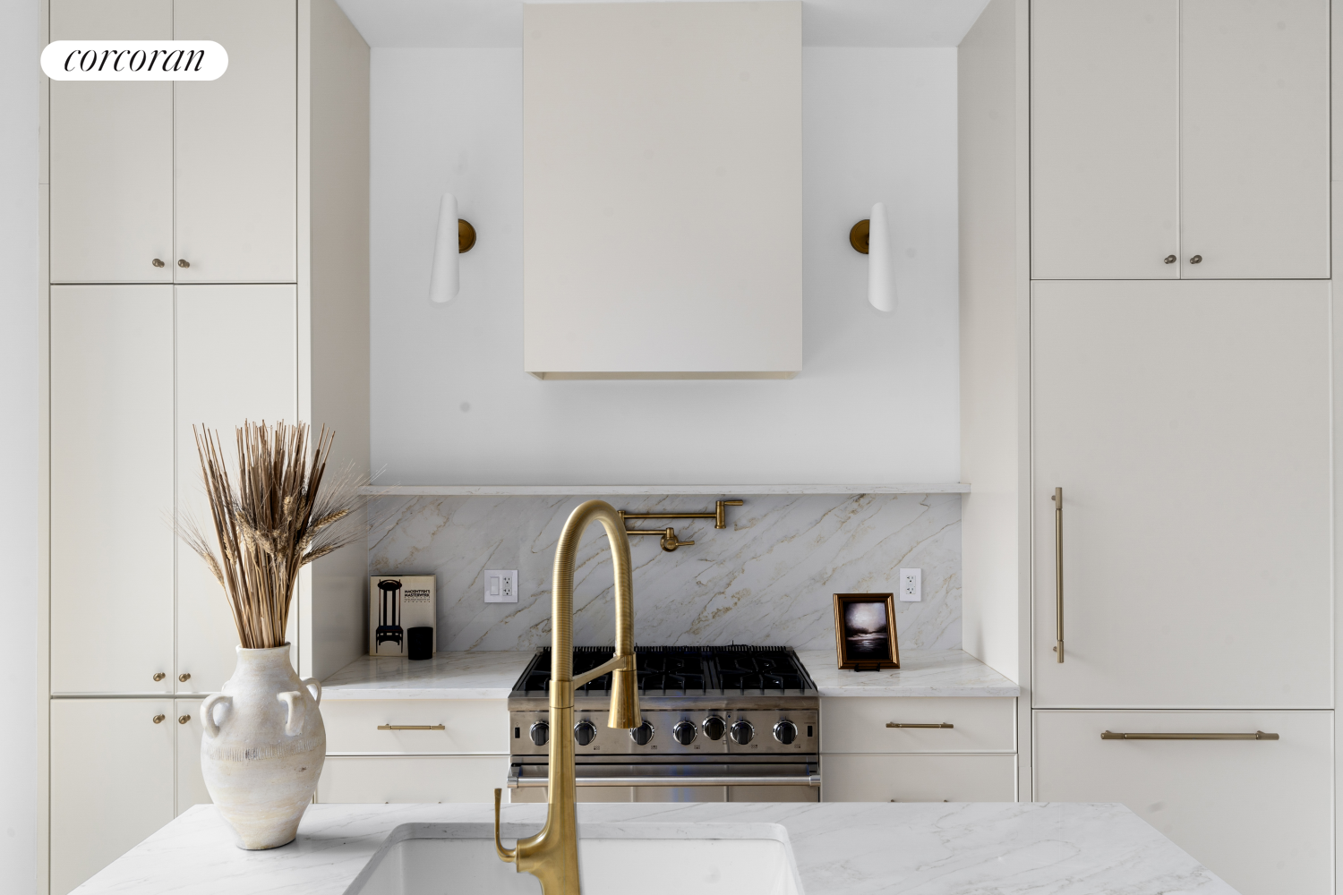 Unleash your inner chef in this stunning kitchen with all the bells and whistles. Here you will find a Viking range with a convenient pot filler and a custom-designed hood that elegantly conceals ventilation. The center island provides plenty of storage and prep space to cook a feast. Across from the island is more storage and a built in Bosch microwave, coffee machine and wine fridge. A beautiful custom door provides direct access to a deck and sprawling backyard. This south west facing private outdoor oasis is an incredible and unusual 76 feet and provides ample space for entertaining, gardening, or simply enjoying the outdoors.
