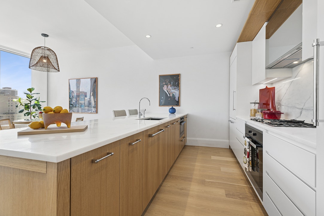 VU's light and airy interiors are carefully crafted by renowned interior designer Paris Forino to complement soaring ceilings and panoramic city and East River views. Living spaces in soothing neutral tones with handsome accents create a sophisticated aesthetic. Kitchens at VU imbue a feeling of comfort and convenience. Appointed in a sophisticated and light palette of natural materials such as marble, bleached oak, and white lacquer, outfitted with Miele appliances, they are a chef's dream. Spacious primary bathrooms feel like a tranquil spa getaway with walls clad in oversized soft white marble tiles and an intricate mosaic floor pattern comprising of three different marbles. Sinks and showers are complimented by The Grace Collection, Paris Forino's custom line of faucets and fixtures for Waterworks in polished chrome, produced exclusively for VU New York.