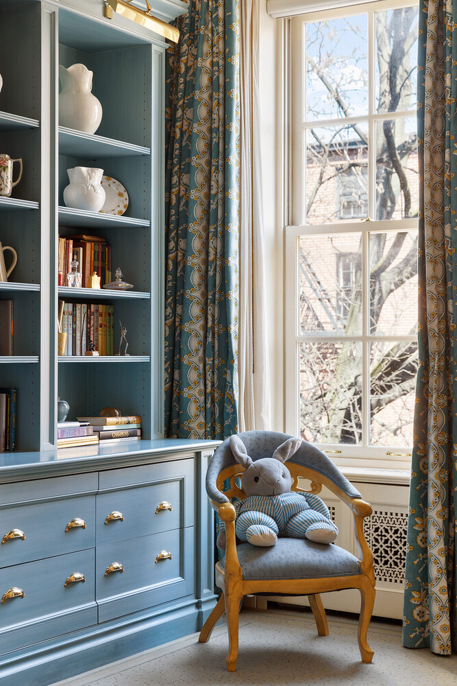 On the parlor level are formal living and dining rooms with 13-foot ceilings, wood-burning fireplaces, custom built-ins, and bay windows. The dining room boasts designer wallpaper from Gracie, a built-in wet bar, and access to a landscaped backyard patio for seamless indoor outdoor entertaining. Adjoining the dining room is a windowed galley kitchen featuring barrel vaulted ceilings, marble floors, an oculus, a breakfast nook, and high-end appliances from Viking and Sub-Zero.