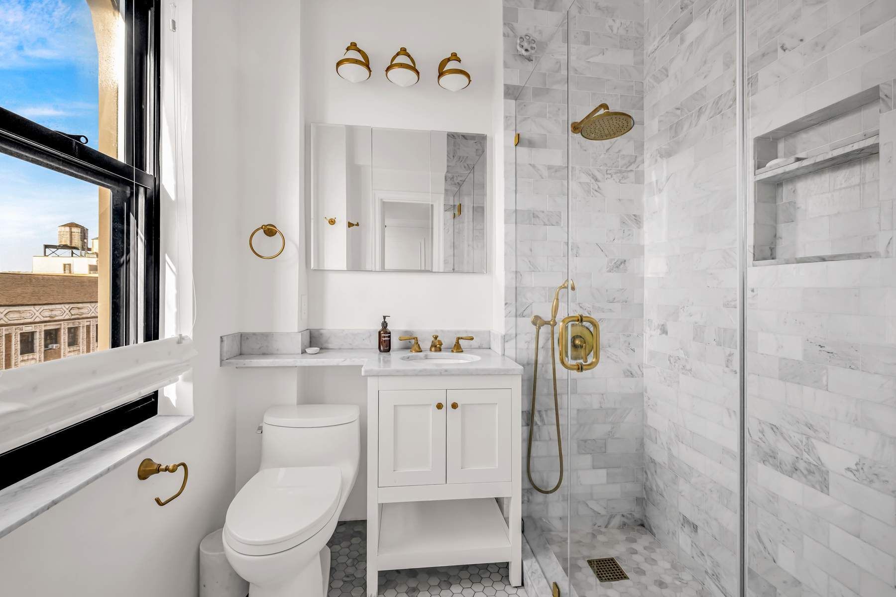 The large Bedroom Suite, with enough space for a king size bed and two additional closets offers a new en-suite, windowed Bathroom outfitted with marble tiles/countertops and beautiful hardware.