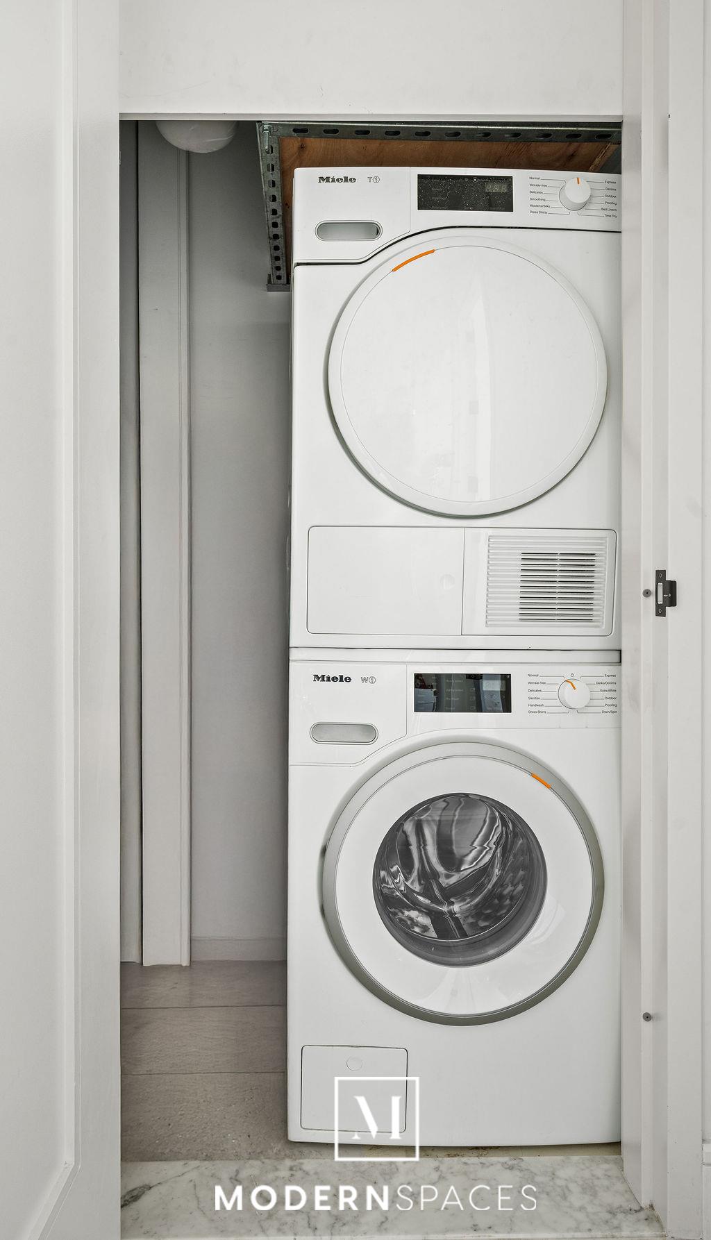 The sizable living area includes beautiful custom built-in entertainment and bookshelves from California Closets, along with wiring for a ceiling chandelier. Extending your entertaining space, the large 82 sq ft private balcony offers stunning views of the Manhattan skyline and the Queensboro Bridge. The modern kitchen is equipped with custom designer white oak cabinetry, quartz countertops with a waterfall edge and backsplash, and premium Miele appliances. The spacious bedroom comfortably accommodates a king-sized bed and additional furnishings, and includes a large closet with custom California Closets. The modern bathroom features elegant porcelain tiles, a large soaking tub with an upgraded built-in enclosed sliding glass door, and radiant heated floors. Additional amenities within the unit include a Miele washer/dryer, custom Shade Store smart blackout window treatments, and Smart Latch access to the apartment.