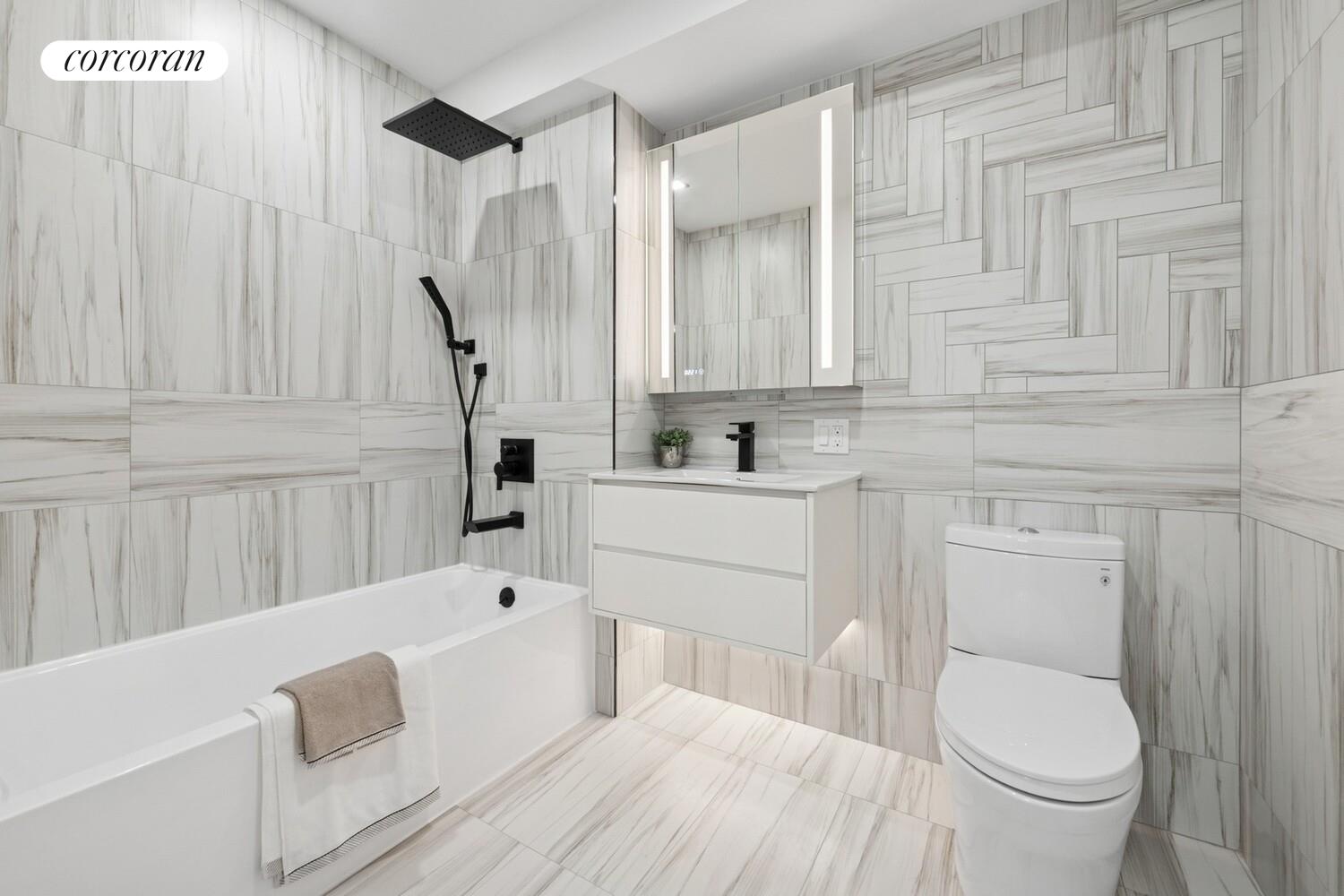 The bathrooms are a sanctuary of luxury, adorned with imported porcelain tiles and outfitted with radiant heated floors for a spa-like experience. Medicine cabinets with built-in clocks and LED lighting, heated anti-fog mirrors, and dual flush toilets. The floating vanities with LED under-cabinet lighting feature push-to-open storage drawers, providing both functionality and elegance. Additionally, the bathroom has a deep soaker tub, perfect for ultimate relaxation. Units with a second bathroom feature stall showers with floor-to-ceiling glass partitions, adding a sleek and modern touch.